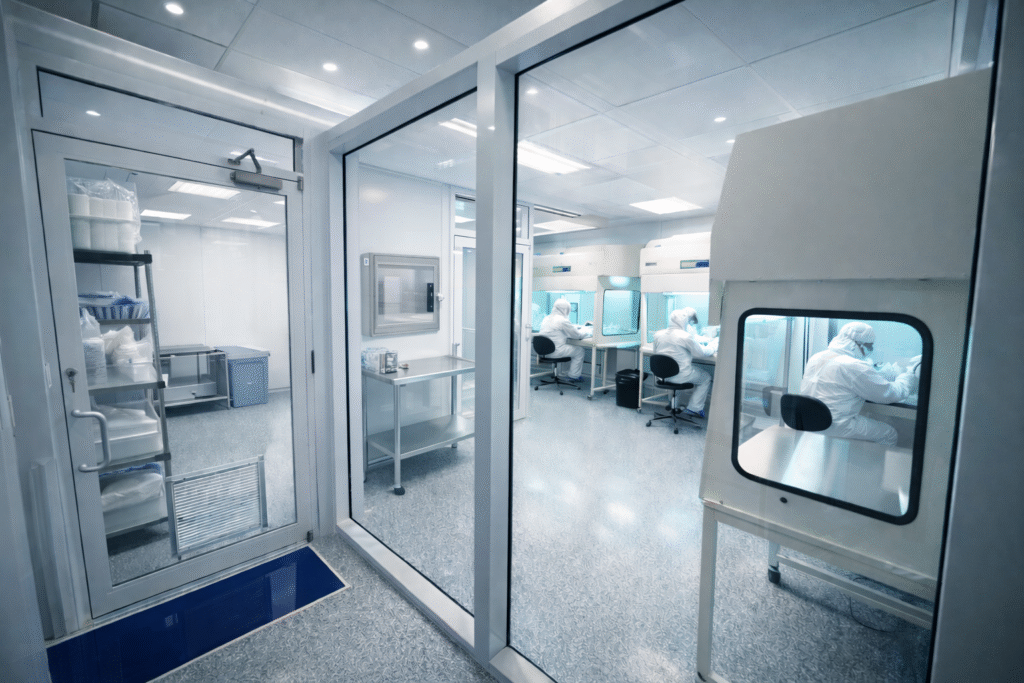 Advanced filtration systems continuously remove airborne particles and maintain sterile conditions.